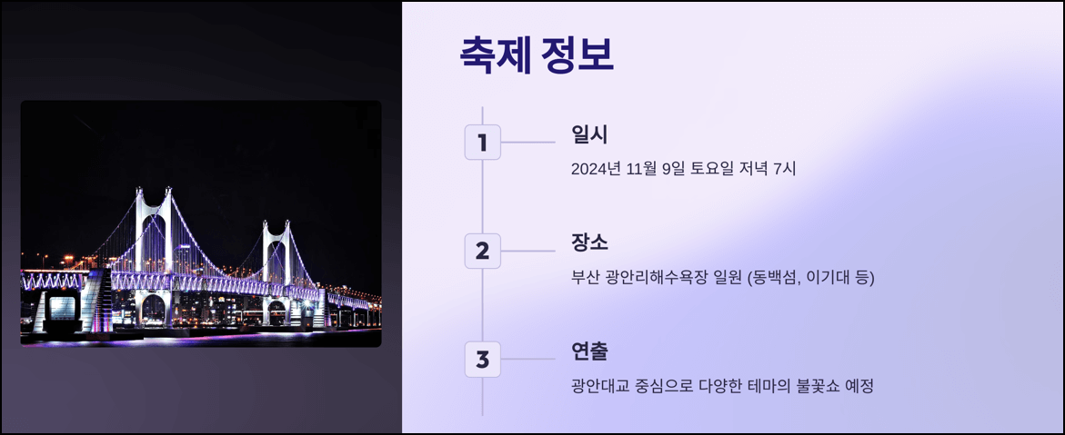 - 주요 연출: 광안대교를 중심으로 다양한 테마의 불꽃쇼가 펼쳐질 예정입니다.