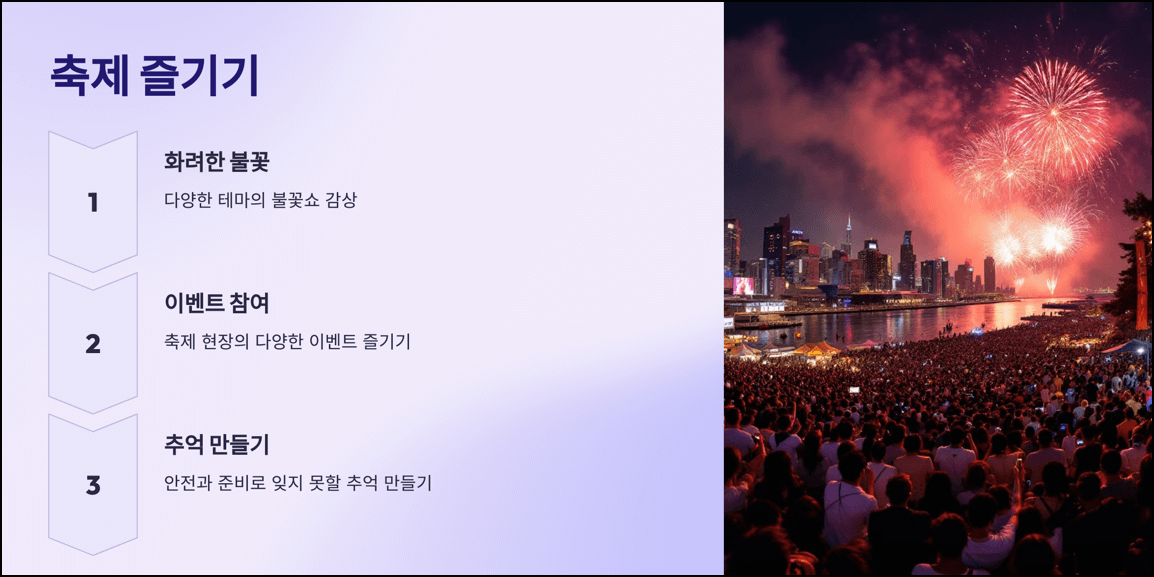 부산불꽃축제는 화려한 불꽃과 다양한 이벤트로 많은 이들에게 잊지 못할 추억을 선사합니다. 철저한 준비와 안전을 고려하여 즐거운 축제를 만끽하시길 바랍니다!
