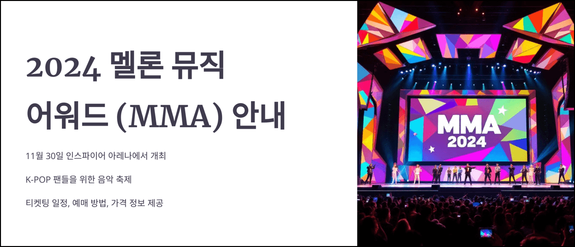 2024년 멜론 뮤직 어워드(MMA)는 많은 K-POP 팬들이 손꼽아 기다리는 음악 축제입니다. 이번 MMA 2024는 11월 30일 인스파이어 아레나에서 개최되며, 다양한 아티스트들이 참여해 최고의 무대를 선보일 예정입니다.