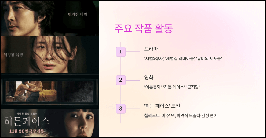 - 다양한 연기 스펙트럼: 드라마부터 스릴러 영화까지 폭넓은 연기 도전을 이어가고 있습니다.
