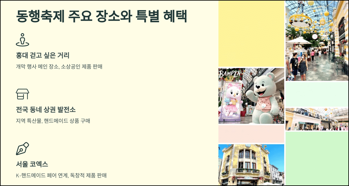 이번 동행축제는 전국 여러 장소에서 열려 소비자와 소상공인이 만나는 뜻깊은 시간을 제공합니다. 아래 주요 장소와 그 혜택을 알아보세요.