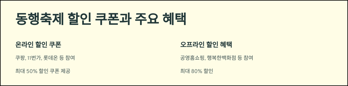 동행축제는 다양한 할인 쿠폰을 통해 소비자들에게 경제적 부담을 줄이는 데 초점을 맞춥니다. 주요 온라인 쇼핑몰과 오프라인 매장에서 폭넓은 혜택을 제공합니다.