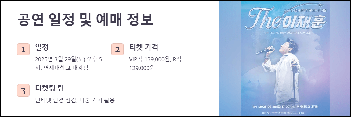 | 이재훈 대구 콘서트 2025: 일정, 예매, 공연장 정보 총정리 (0) | 2025.01.17 |