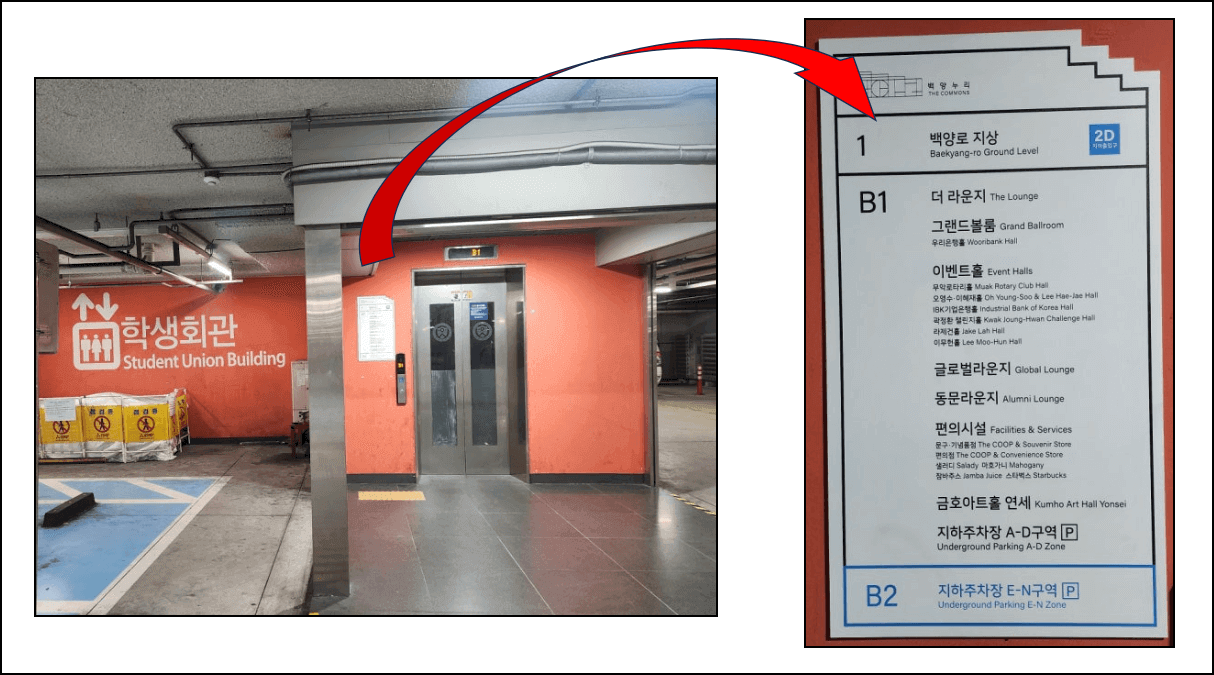 - 주차 후 L4 구역에서 엘리베이터를 이용하여 백양로로 이동