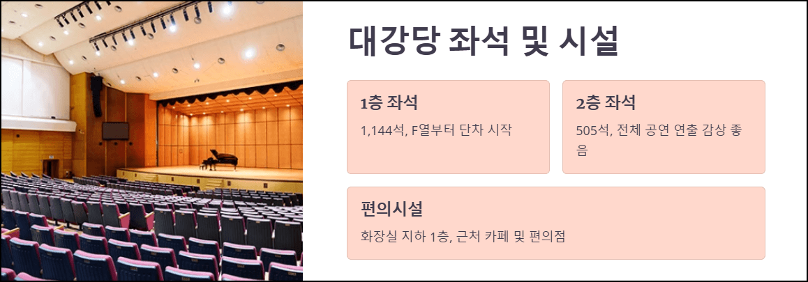 - 2층 좌석 추천: 무대 전체를 조망하며 공연의 연출을 즐기기에 적합합니다.