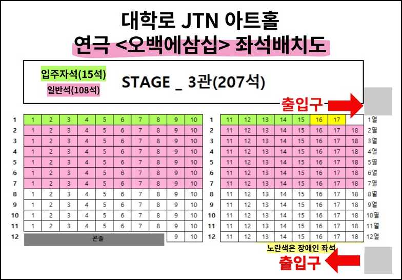 대학로 JTN 아트홀 3관은 총 207석으로 구성되어 있으며, 입주자석과 장애인석이 구분되어 있습니다.