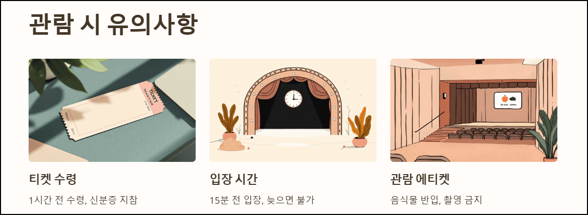 공연을 더욱 즐겁게 관람하기 위해 꼭 확인해야 할 사항들을 정리했습니다.