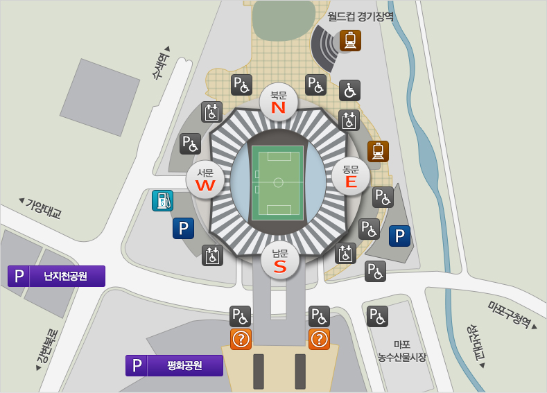 경기장 바로 서쪽에 위치, 가장 접근성이 좋지만, 주차 공간 부족, 주차 요금 비쌈 - 홈플러스 월드컵 지상주차장: