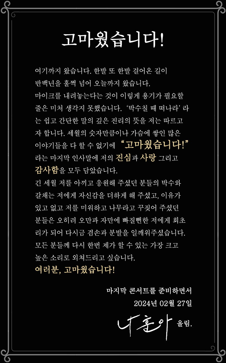 나훈아의 용기와 결단이 표현된 메시지입니다. 그의 말처럼 2024년은 반백년동안 최고의 자리를 지켜왔던 한국 가요계의