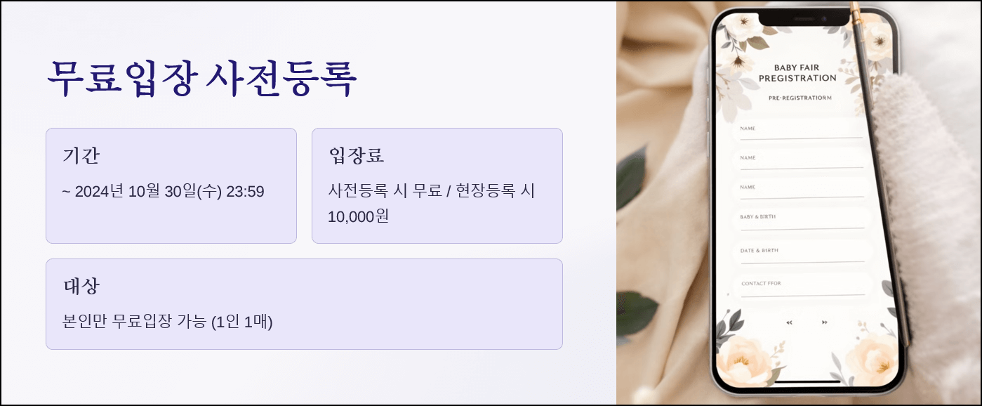 코엑스 코베 베이비페어의 입장료는 현장 구매 시 10,000원이지만, 사전등록을 통해 무료로 입장할 수 있습니다. 사전등록은 10월 30일(수) 23:59까지 진행되며, 등록자에게는 카카오톡이나 문자로 입장 바코드가 전송됩니다. 입장 당일 현장에서 바코드를 확인 후 입장 팔찌를 수령하면 빠르고 간편하게 입장할 수 있습니다