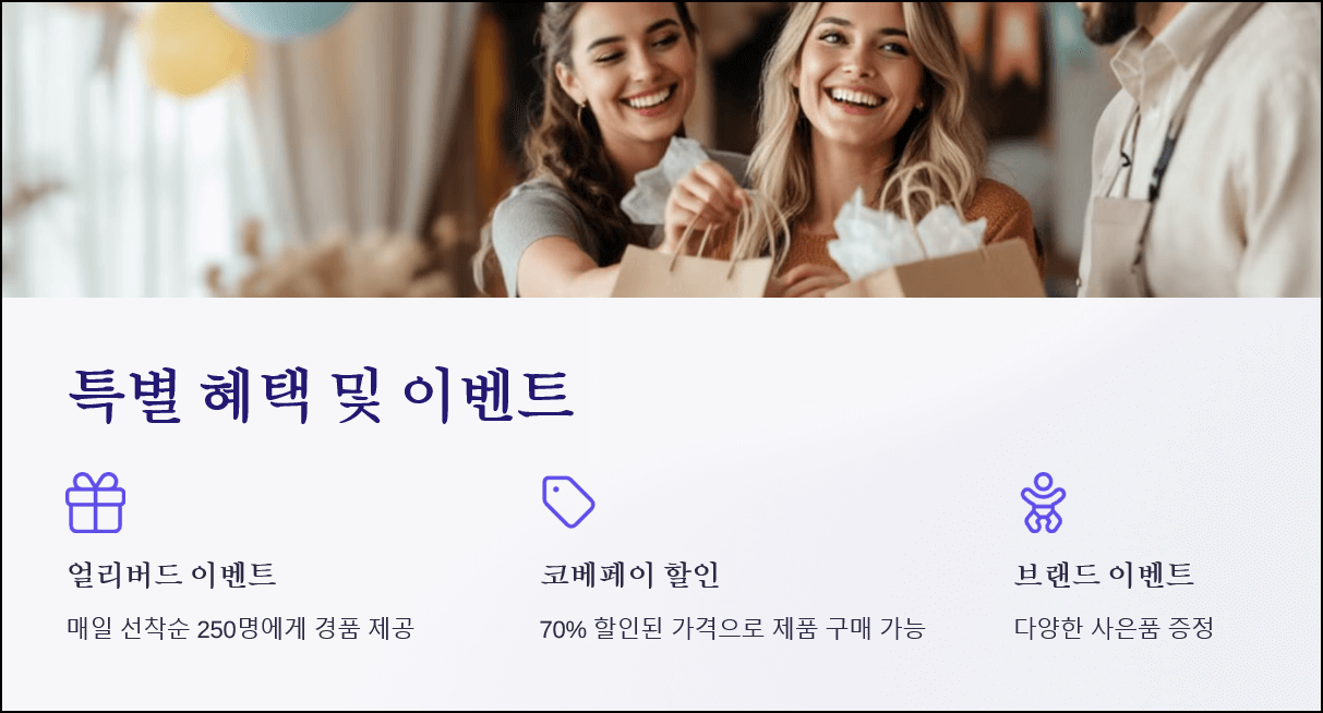 - 다양한 참여 브랜드 이벤트: 물티슈, 로션, 목욕용품 등 다양한 사은품 증정