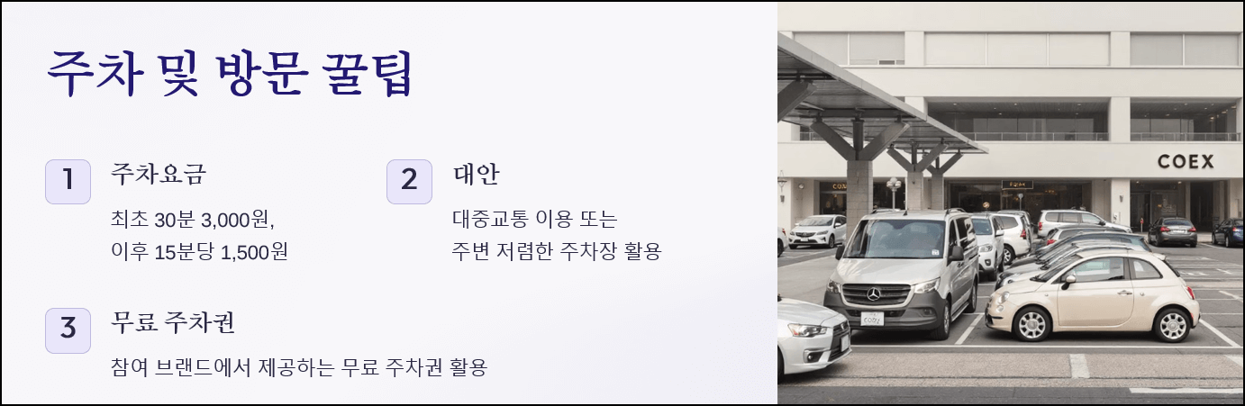 코엑스의 주차요금은 최초 30분에 3,000원, 이후 15분당 1,500원이 부과되며 1일 최대 60,000원입니다. 주차비 부담이 있으므로 대중교통을 이용하거나 주변의 저렴한 주차장을 이용하는 것도 좋은 방법입니다. 또한 압타클럽과 같은 참여 브랜드에서 무료 주차권을 제공하니 이를 활용하면 더욱 경제적입니다.